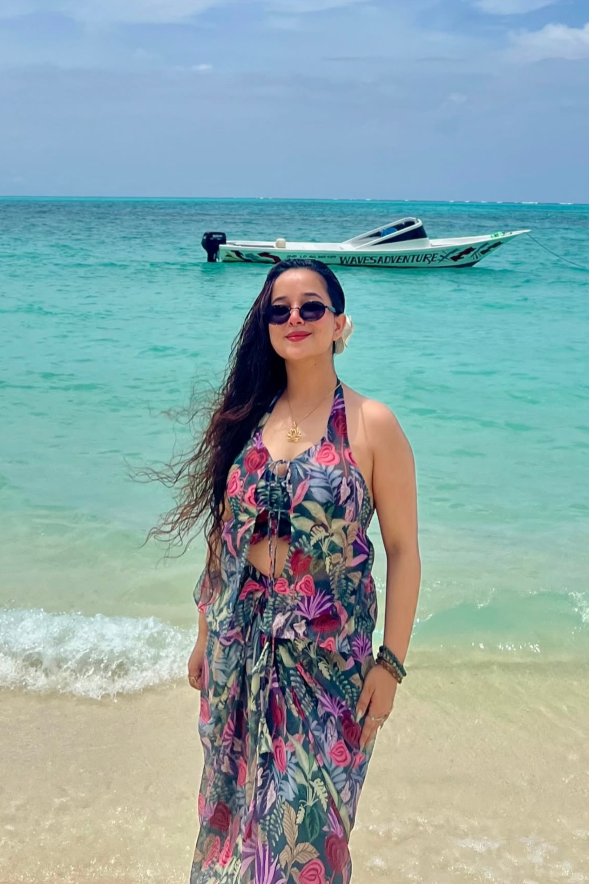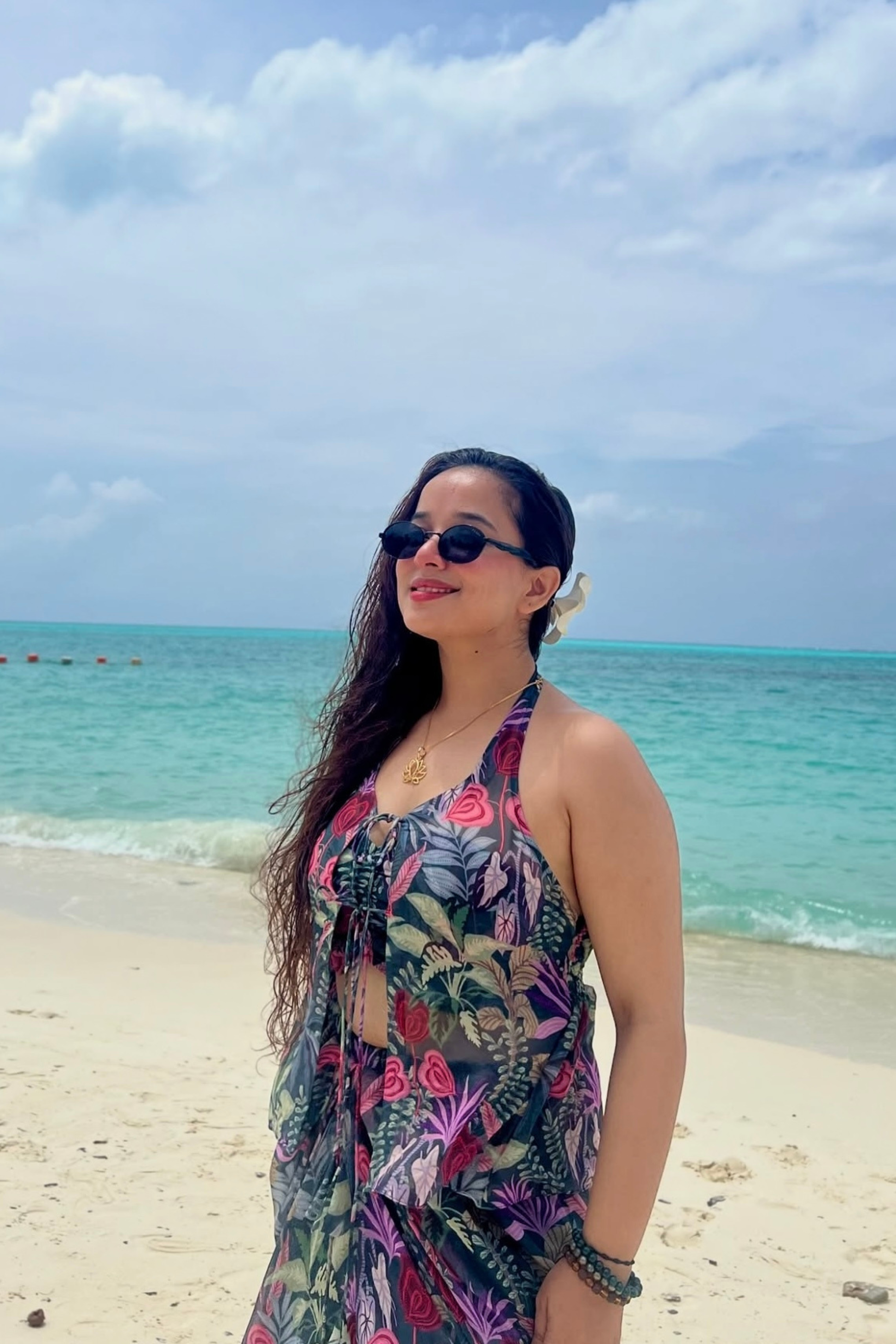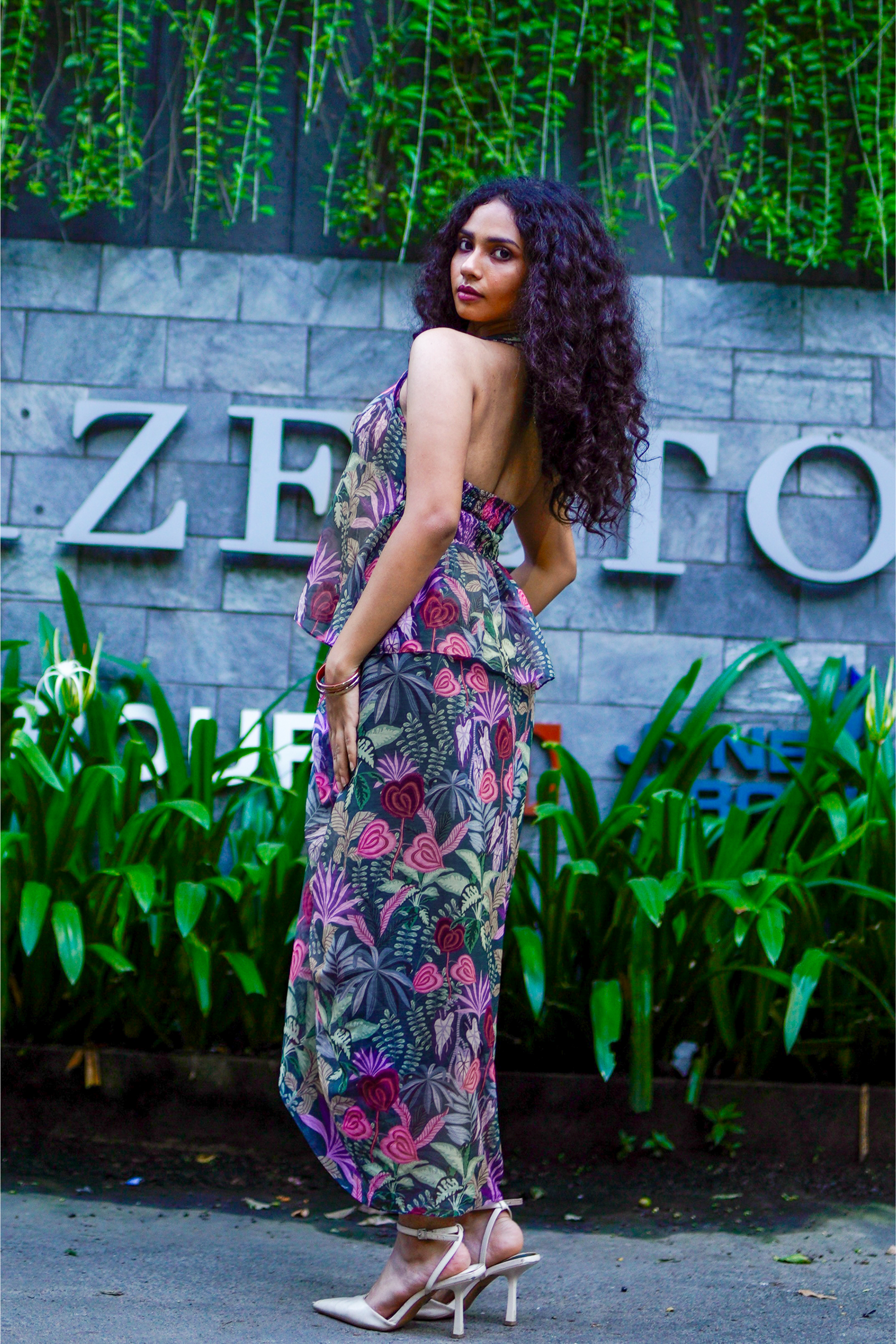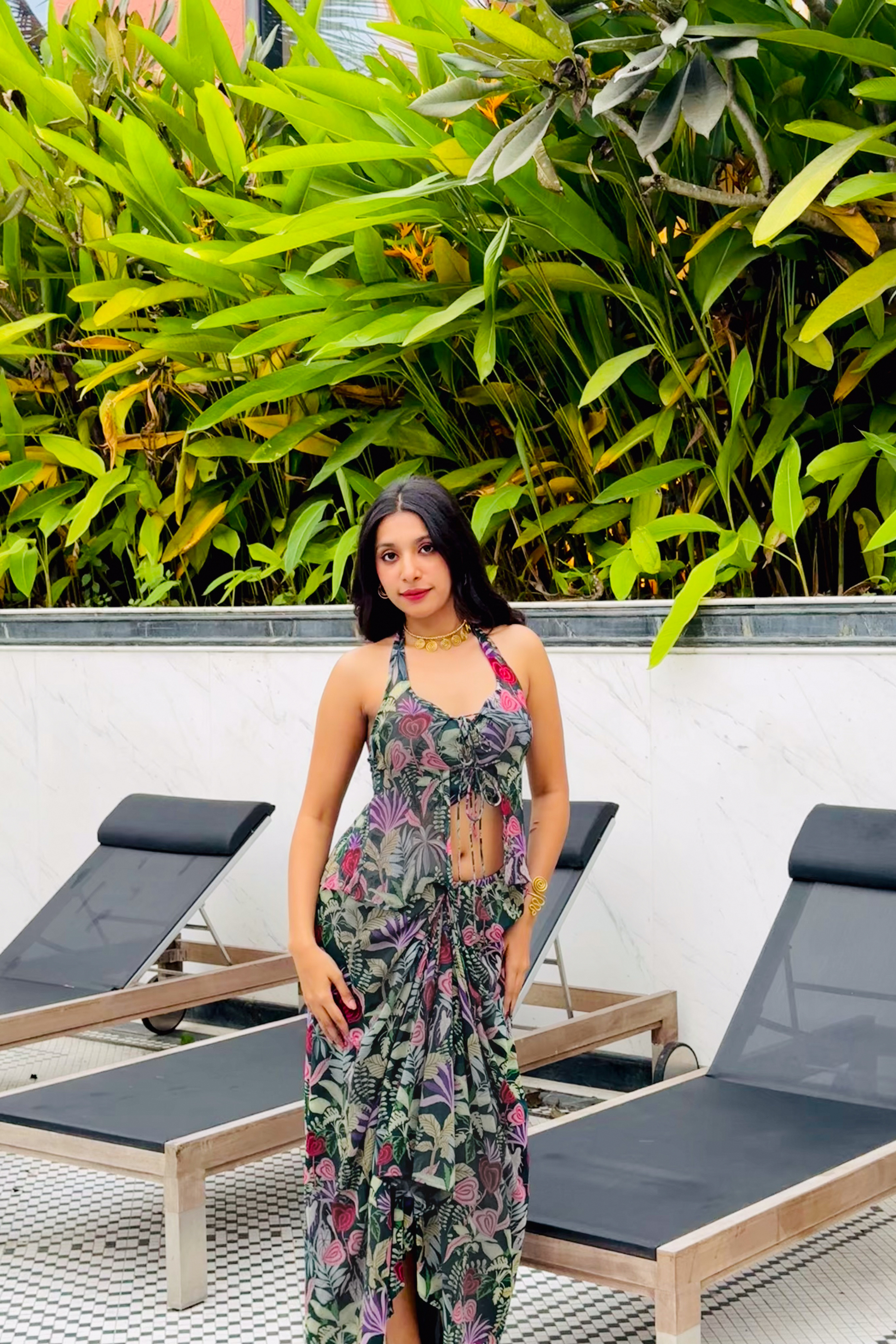 • Fit: Halter neck top with adjustable front tie | Draped mid-rise skirt with flattering gathers