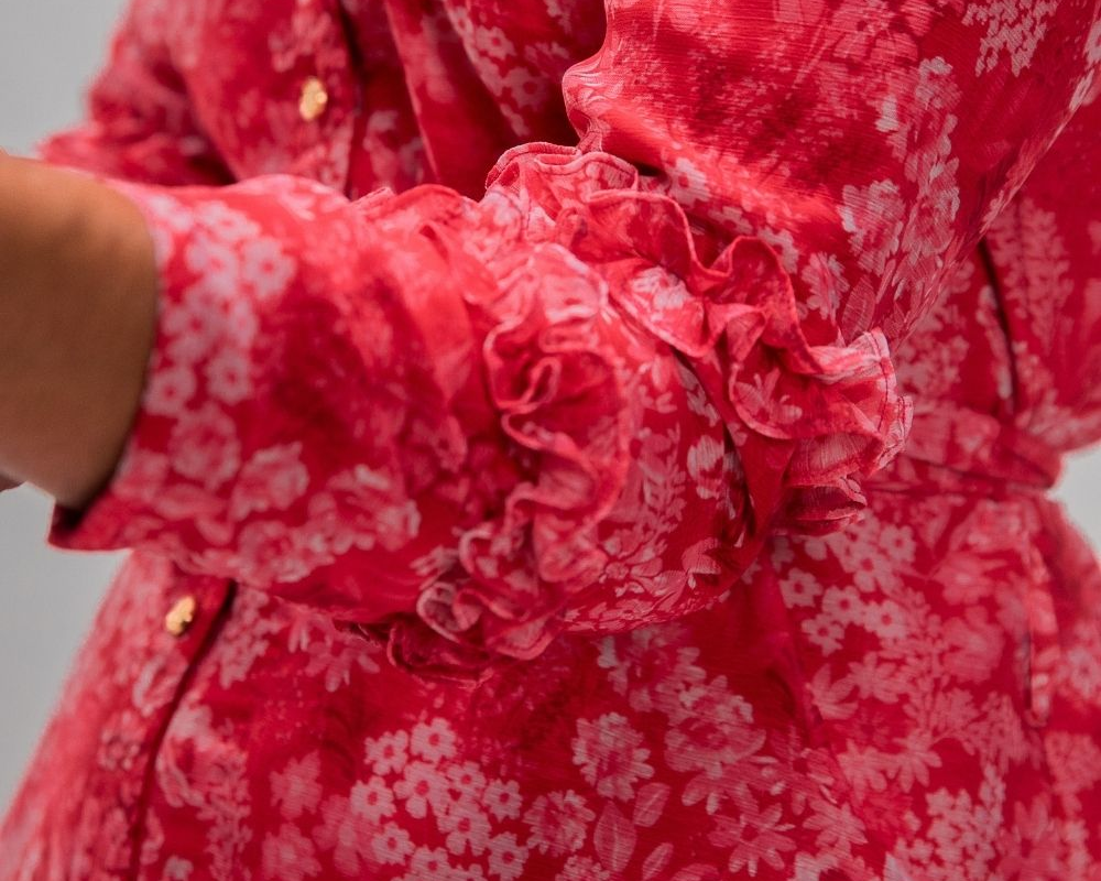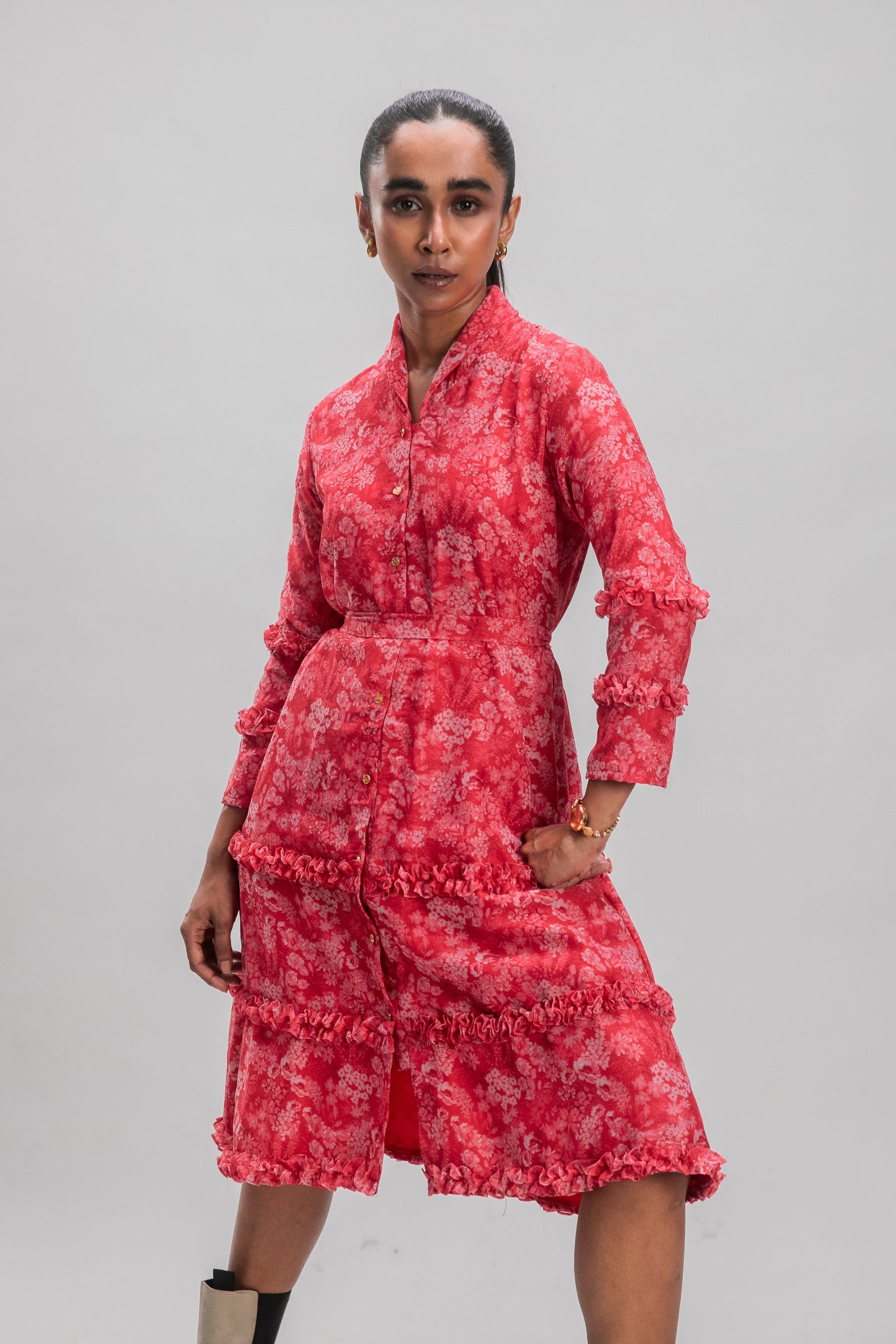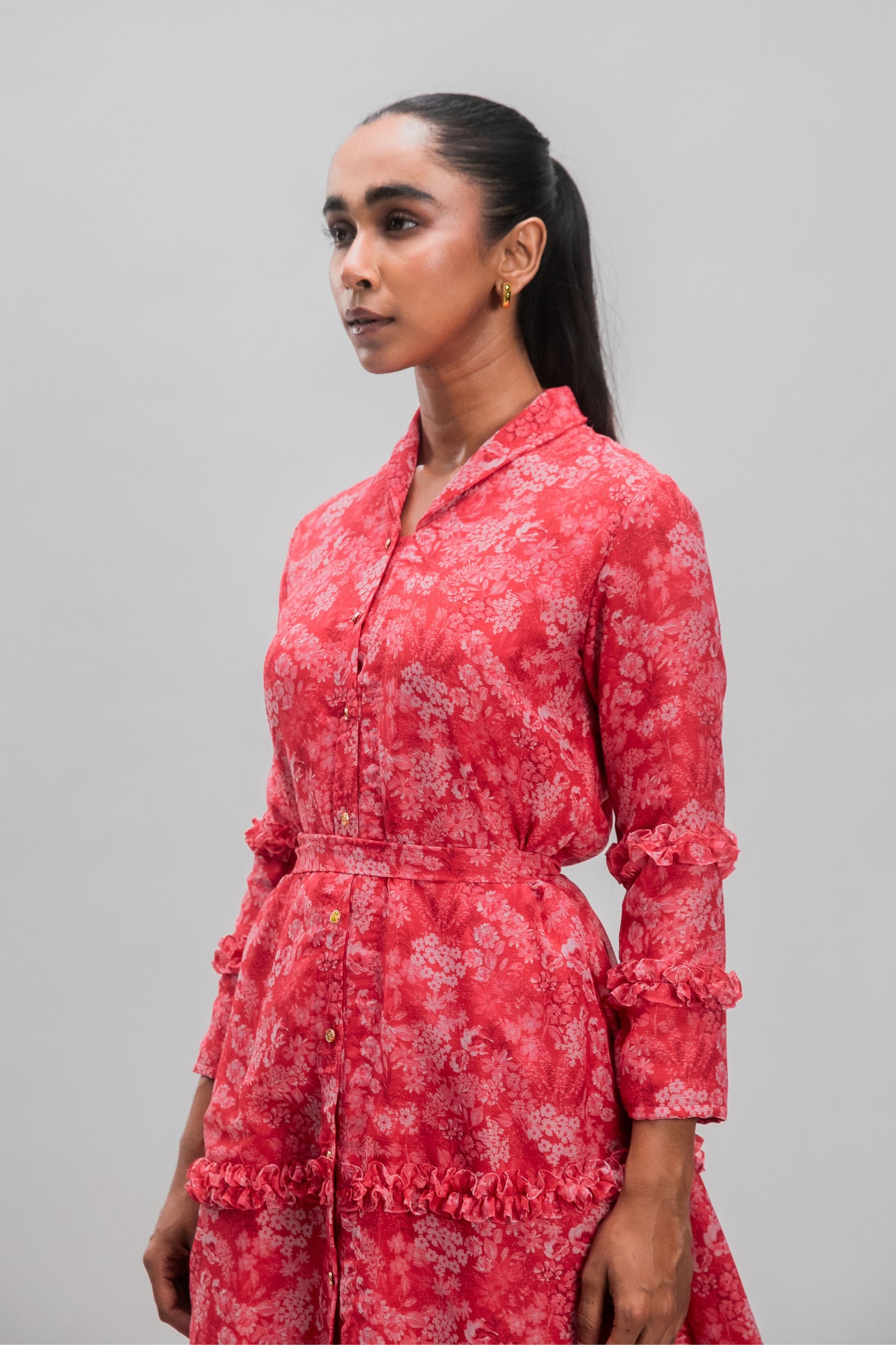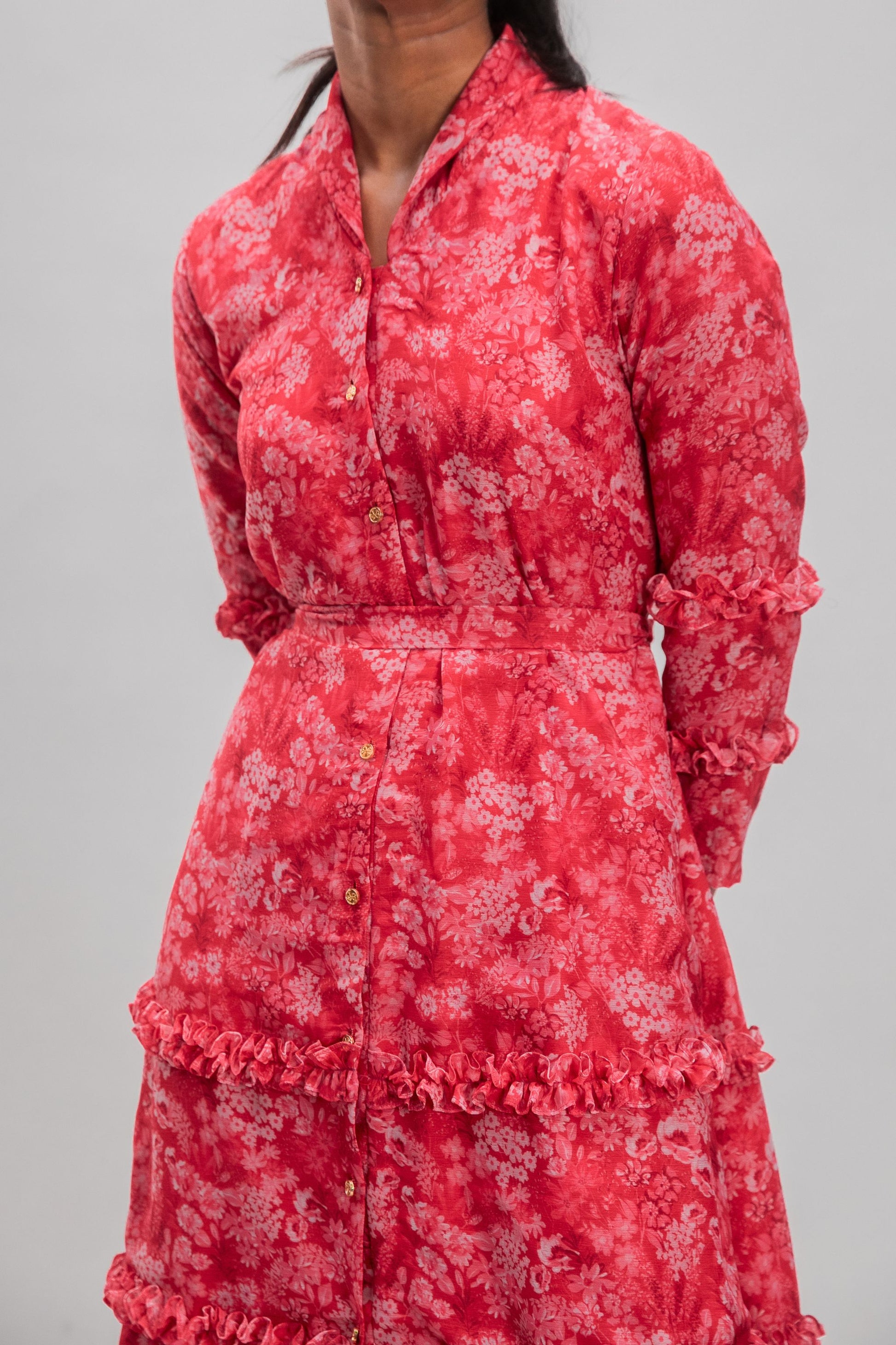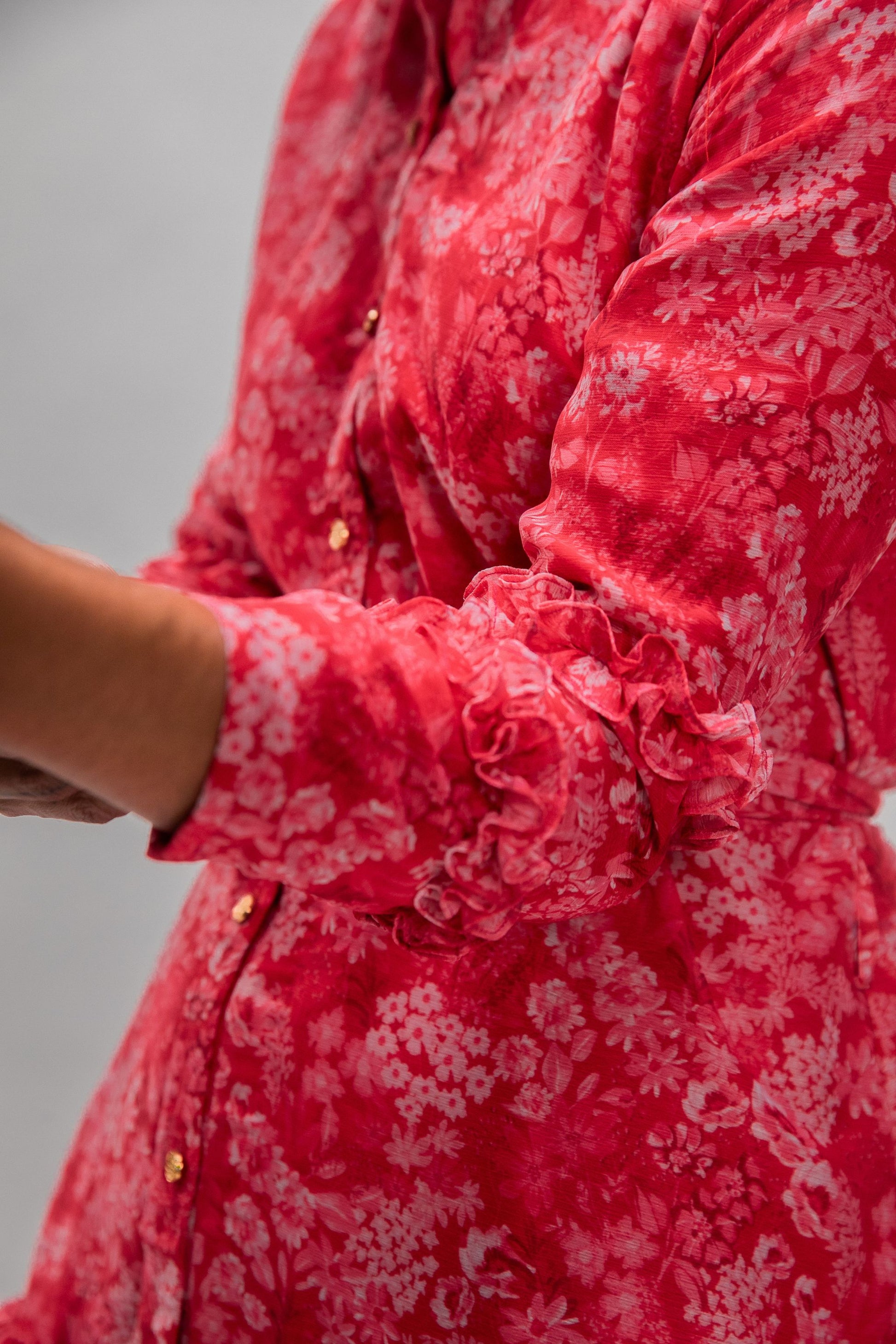 • Colour Story: Fiery cherry red drenched in soft rose florals — vivid, romantic, and strikingly fresh.