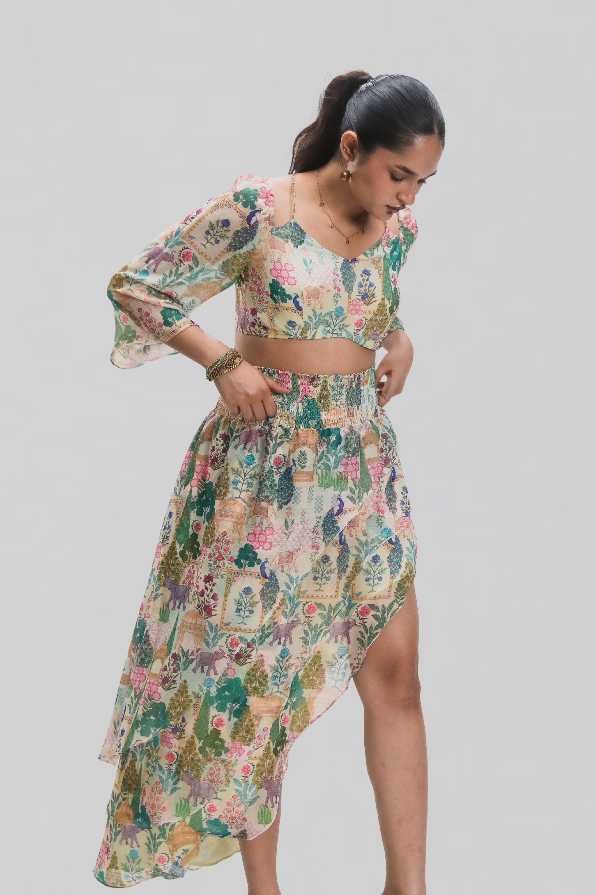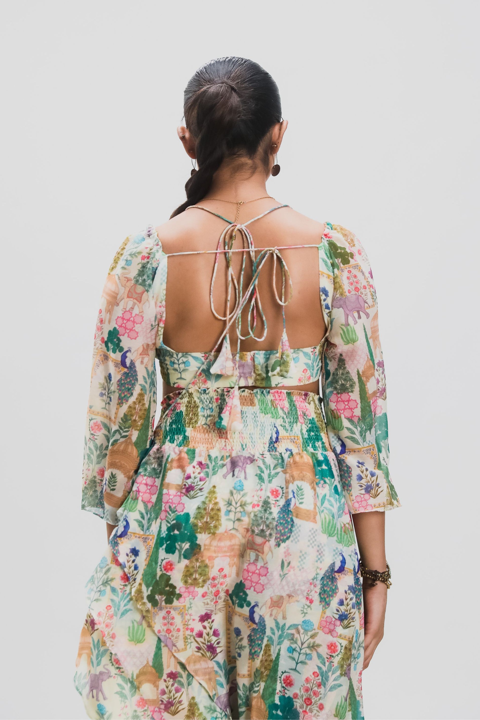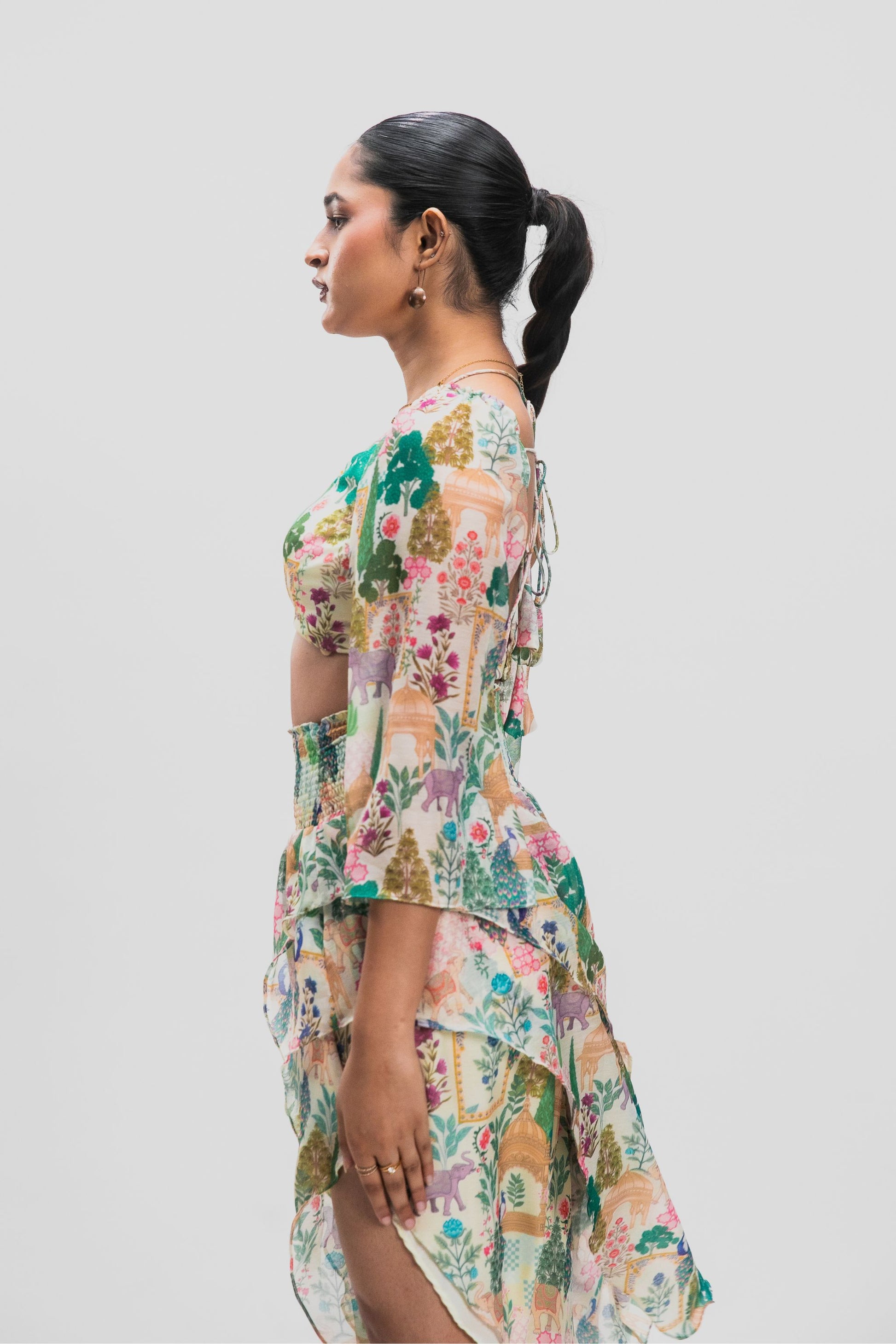 • Colour Story: Muted ivory kissed with bright pops of citrus, teal, sage, and blush — echoing temple frescos and springtime reverie.