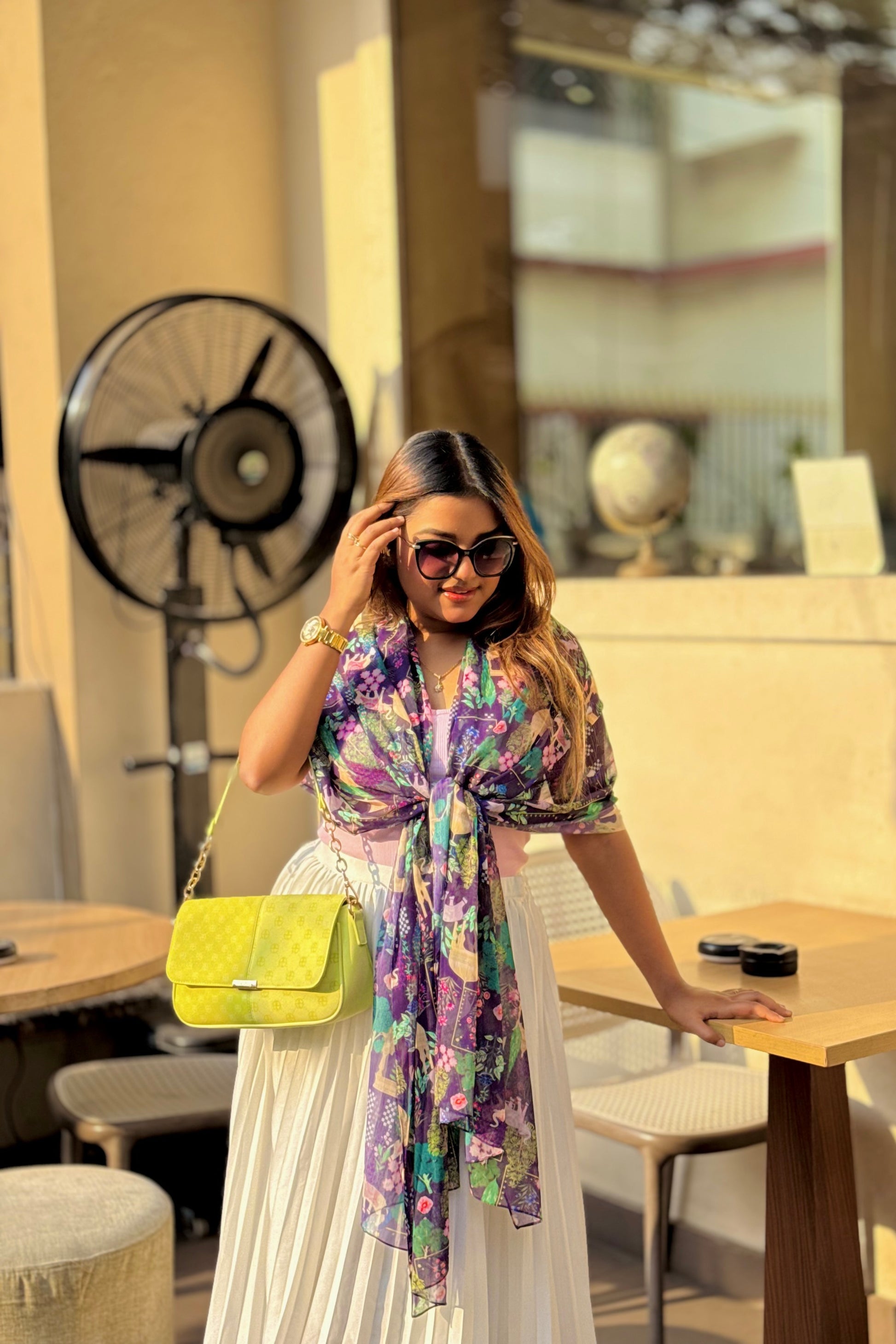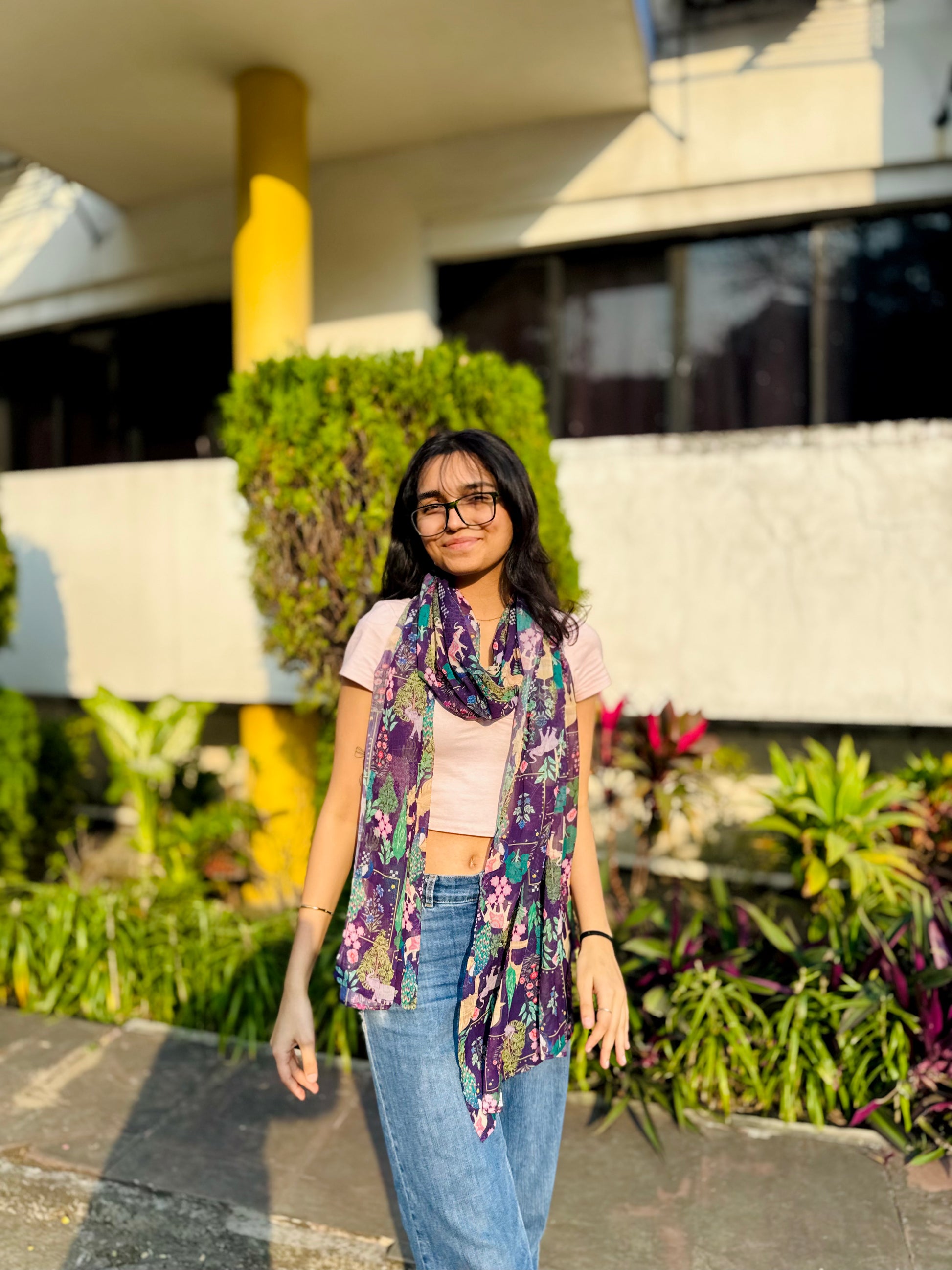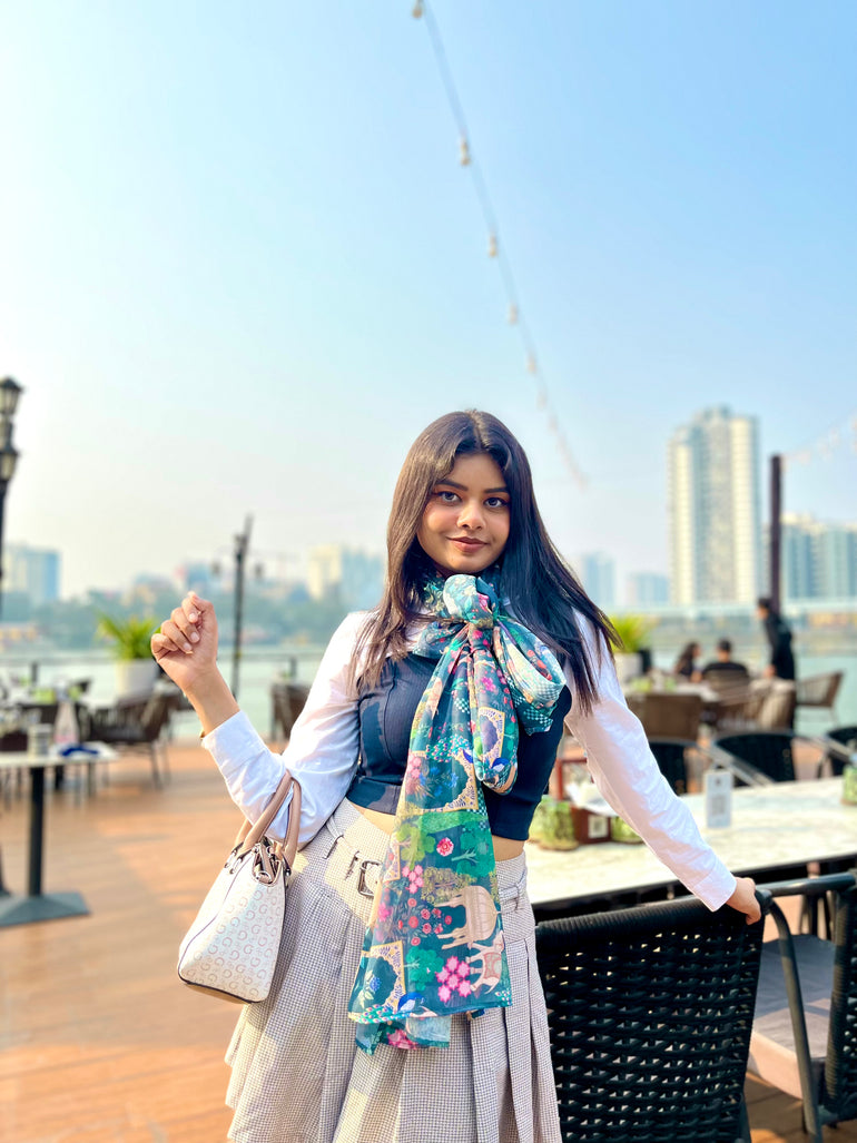 The Fusion Belt: For a modern silhouette, drape the scarf over a solid maxi dress and cinch it at the waist with a slim tan belt. This highlights the fabric's fluid movement while adding structure to your look.