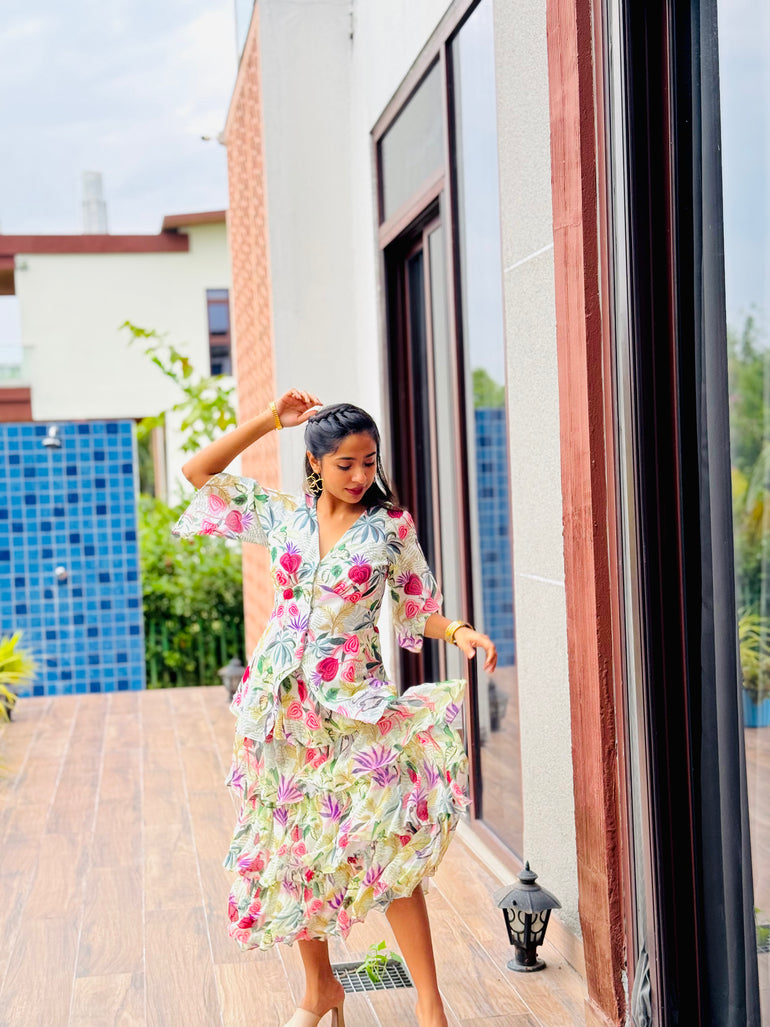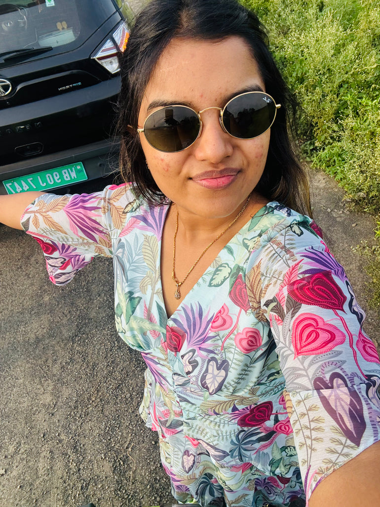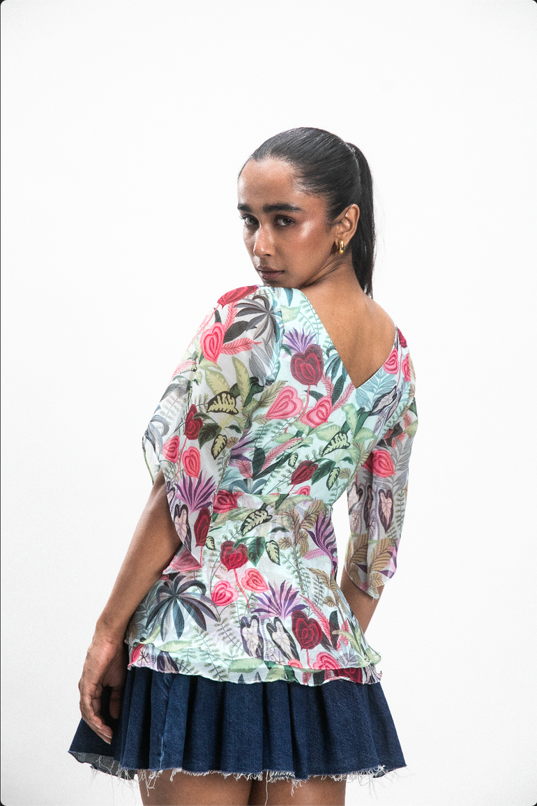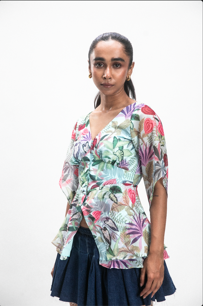 Pair Yaravi with the Bristi Vyara Skirt for a dreamy, coordinated ensemble that flows with grace. Or style it with denim or wide-leg trousers for a playful high-low mix. Add sculptural earrings, a classic golden watch, and strappy heels — effortless, feminine, and full of charm.